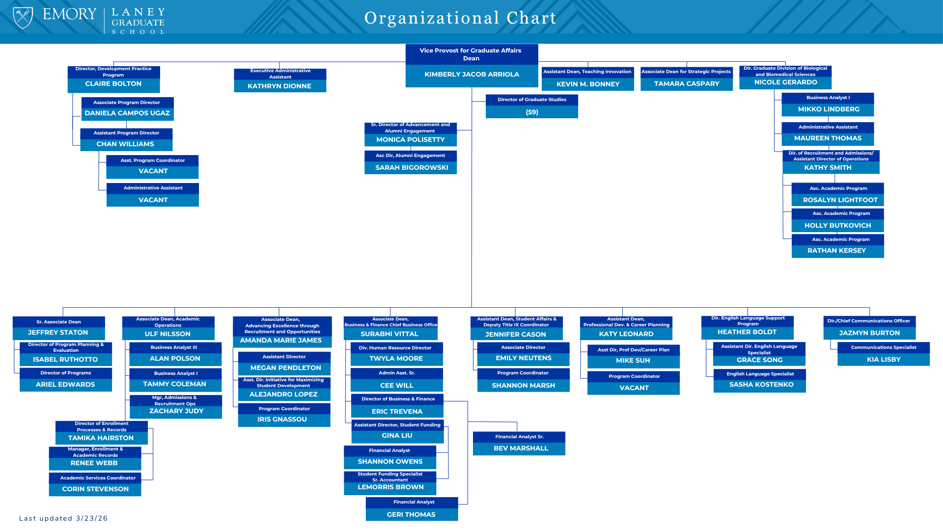 | Kimberly Jacob Arriola Vice Provost for Graduate Affairs & Dean, James T. Laney School of Graduate Studies | lgsdean@emory.edu 404-727-2600 |